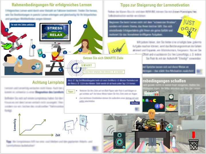 Designt wurde ein ausgewogener und vielseitiger Mix an Text-, Grafik- und interaktiven Elementen. Mittels Quiz kann am Ende dieser E-Learning-Einheit der eigene Lernerfolg von den Teilnehmenden überprüft werden.
